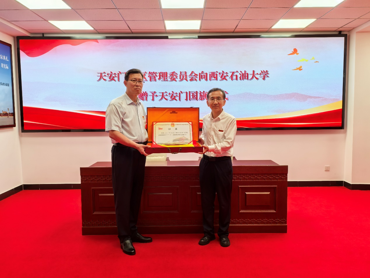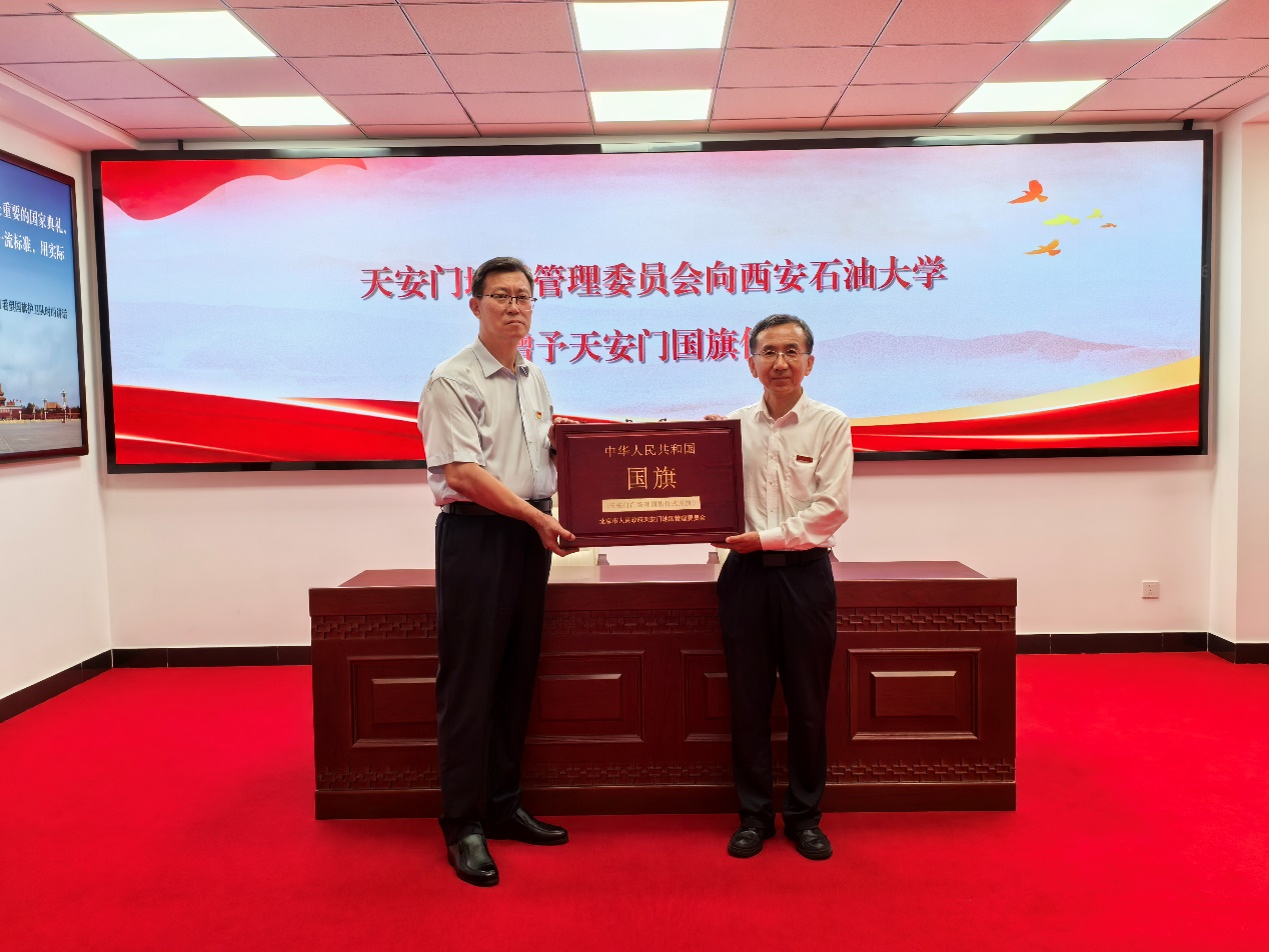 国旗飘扬传承红色基因,砥砺奋进勇担强国使命。9月11日下午,北京市人民政府天安门地区管理委员会向我校赠送天安门广场国旗。赠送国旗仪式在天安门国旗教育馆举行,天安门地区管委会党组成员、副主任(正局长级)姚辉向学校赠送国旗,校党委副书记张木代表学校接收国旗,副校长种宇宏,校友工作与合作交流处、校团委主要负责同志参加赠旗仪式。