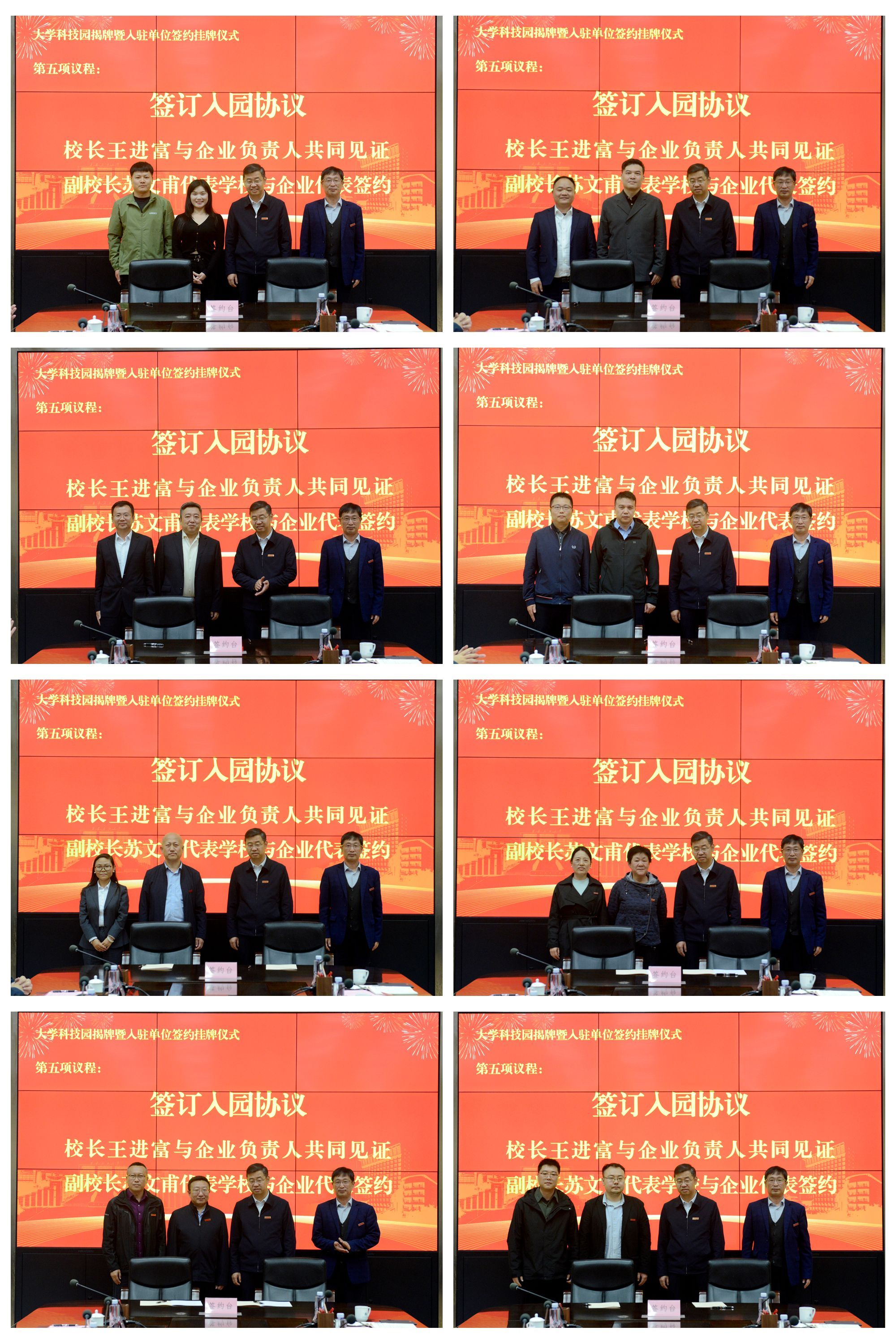 入驻意向协议签订环节中,在王进富校长的见证下,苏文甫副校长代表学校分别与8家入驻企业代表签约,标志着校企资源共享、优势互补、协同创新的合作模式正式开启。