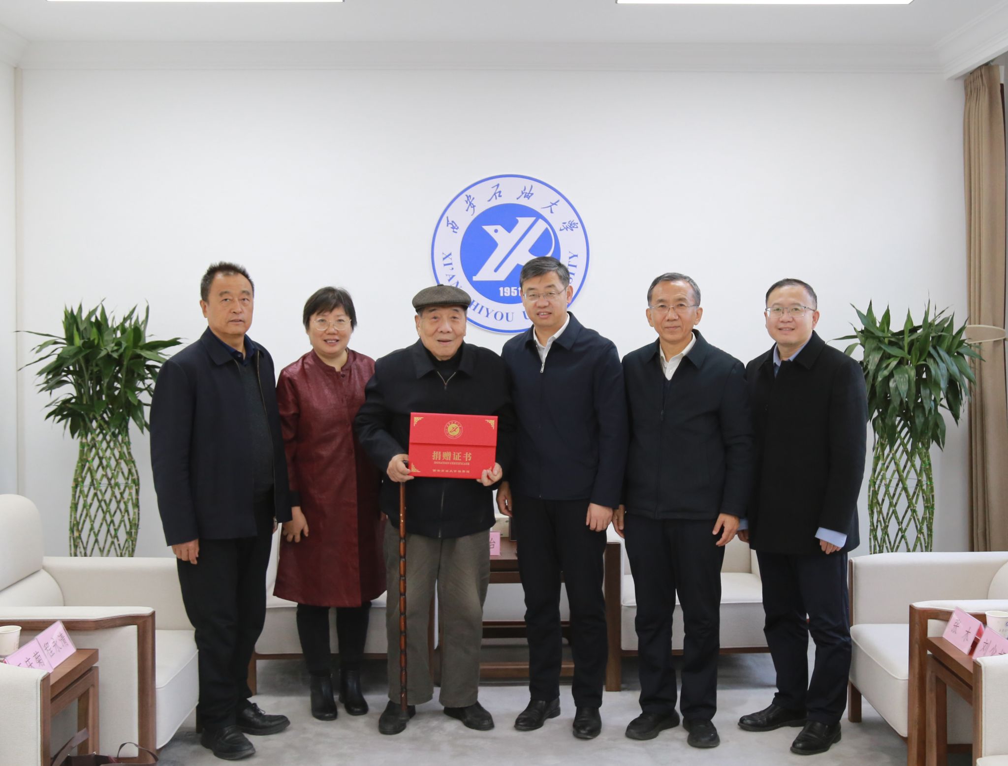 在捐赠环节,王进富代表学校接受了捐赠,并为王国治校友颁发捐赠证书;张木向王国治校友赠送了其本人在校求学时的学生登记表及校友徽章;程永清向王国治校友赠送了《西安石油大学史1951-2021》一部。