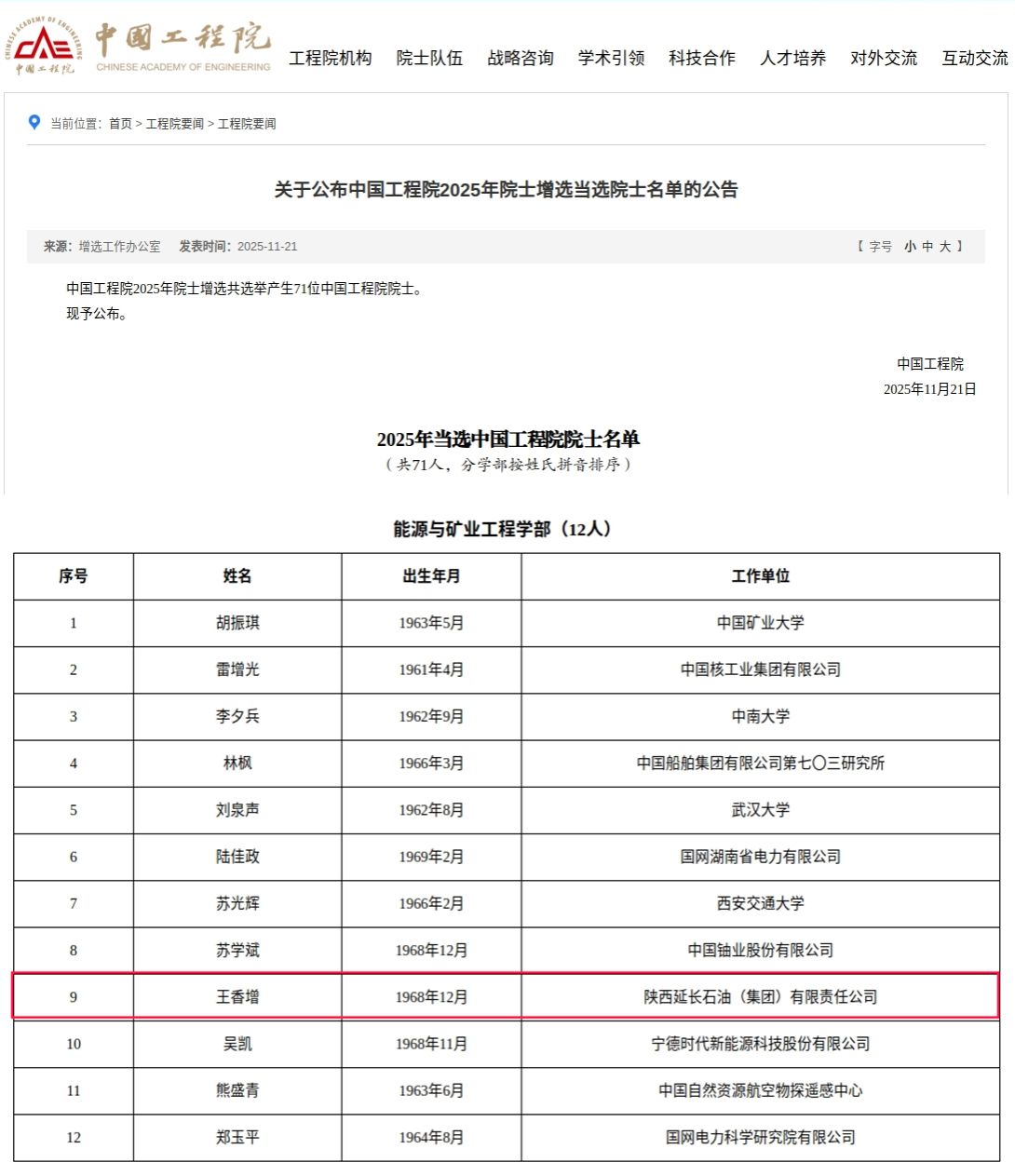 11月21日,中国工程院2025年院士增选结果正式揭晓,共选举产生71位中国工程院院士,其中,能源与矿业工程学部新增院士12人,我校85级校友、碳中和未来技术研究院院长王香增当选。