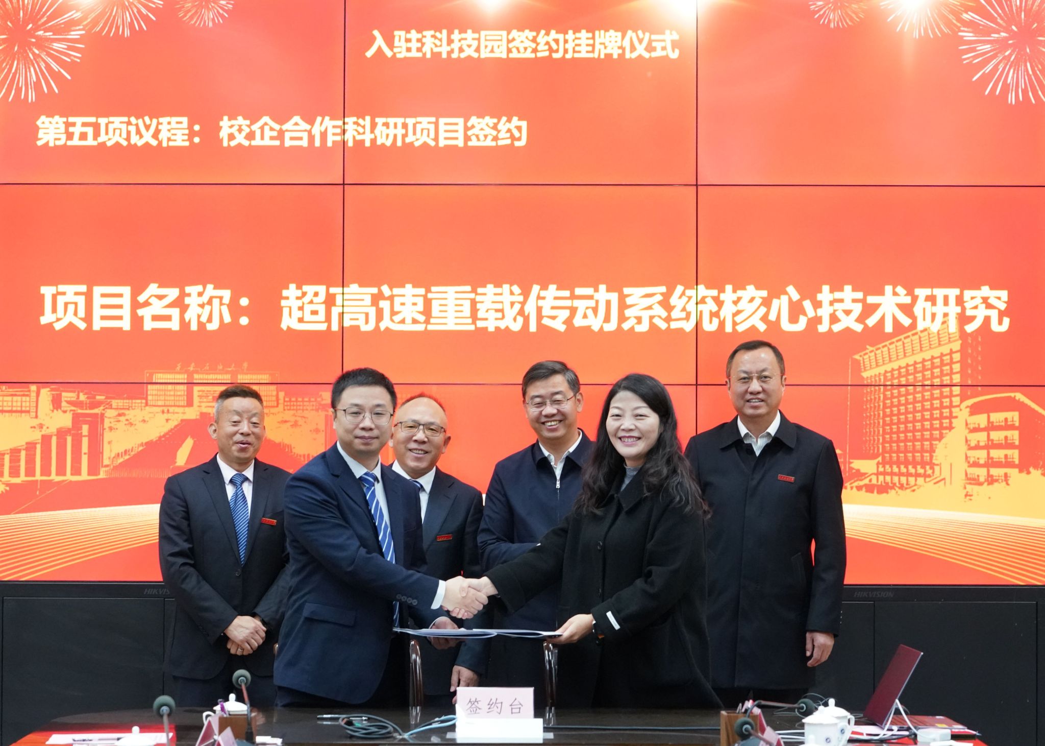 机械工程学院党委书记孟开元代表学院发言,机械工程学院副院长崔璐、智展公司副总工程师江师露进行“超高速重载传动系统核心技术研究”校企合作科研项目签约。